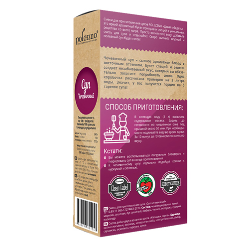 | Состав | Чечевица красная, томат, морковь сушёная, лук сушёный, имбирь, чеснок, петрушка, куркума, кориандр. |