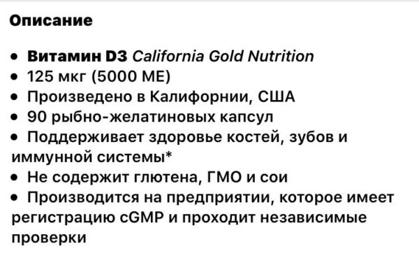 Витамин D3 — предпочтительная для организма форма витамина D. Иногда его называют «витамином солнечного света», поскольку он вырабатывается в коже под воздействием солнечных лучей. Витамин D — незаменимый витамин для многих метаболических процессов. Витамин D3 помогает регулировать усвоение кальция и фосфора и поддерживает нормальную работу иммунной системы*.