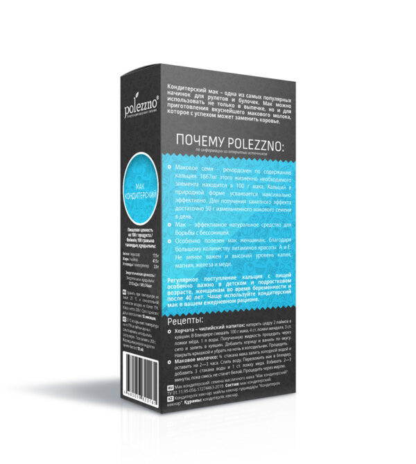 Маковое семя – рекордсмен по содержанию кальция. 1667 мг этого жизненно необходимого элемента находится в 100 г мака. Кальций в природной форме усваивается максимально эффективно. Регулярное поступление кальция с пищей особенно важно в детском и подростковом возрасте, женщинам во время беременности и после 40 лет. Для получения заметного эффекта достаточно 50 г измельченного макового семени в день.