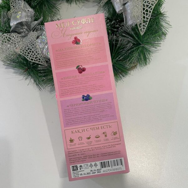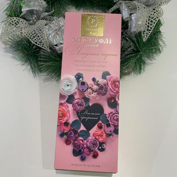 Изысканный комплимент в картонной коробочке — отличный недорогой подарок или дополнение к большому подарку или корзине. Яркий цветной футляр с тиснением, выборочным лаком, в котором на золотом картонном ложементе лежат три баночки разных вкусов. Яркие сочные ягоды, солнце, энергия, витамины в каждой ложке! Состав: натуральный мед, малина сушеная, вишня сушеная, миндаль дробленый, черника сушеная.